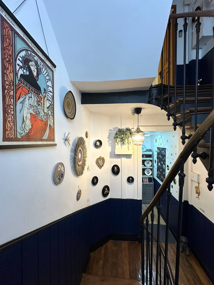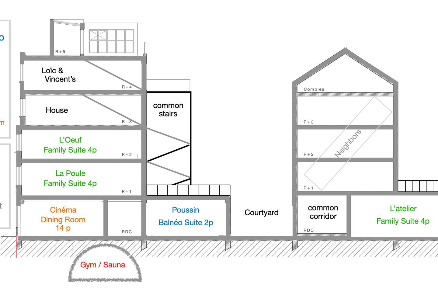 The dining room for 14/cinema is on the ground floor, while the workshop is located on the courtyard side. Two suites are accessible via the internal staircase on the 1st and 2nd floors, the pop room is near the entrance, and Loïc & Vincent live on the upper floors—feel free to reach out if needed.